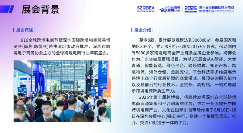 Die Shenzhen International Cross-Border E-commerce Trade Fair - Global Cross-Border E-commerce Festival (SZCBEA) ist die weltweit größte und hochrangigste internationale Messe im Bereich des grenzüberschreitenden E-Commerce und bringt Branchenführer aus mehr als 50 Ländern und Regionen unter dem Motto „Digitale Ermächtigung, globale Vernetzung“ zusammen, um gemeinsam einen umfassenden Plan für die Entwicklung des grenzüberschreitenden E-Commerce zu entwerfen.
